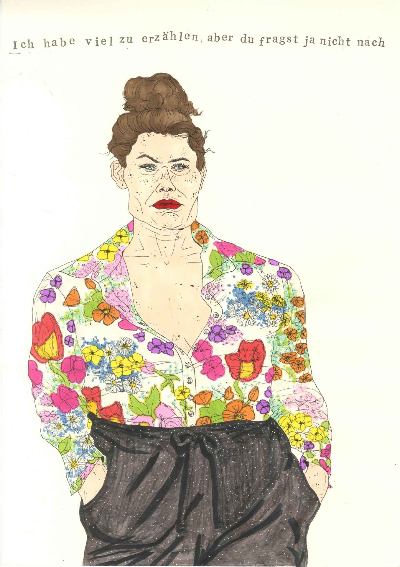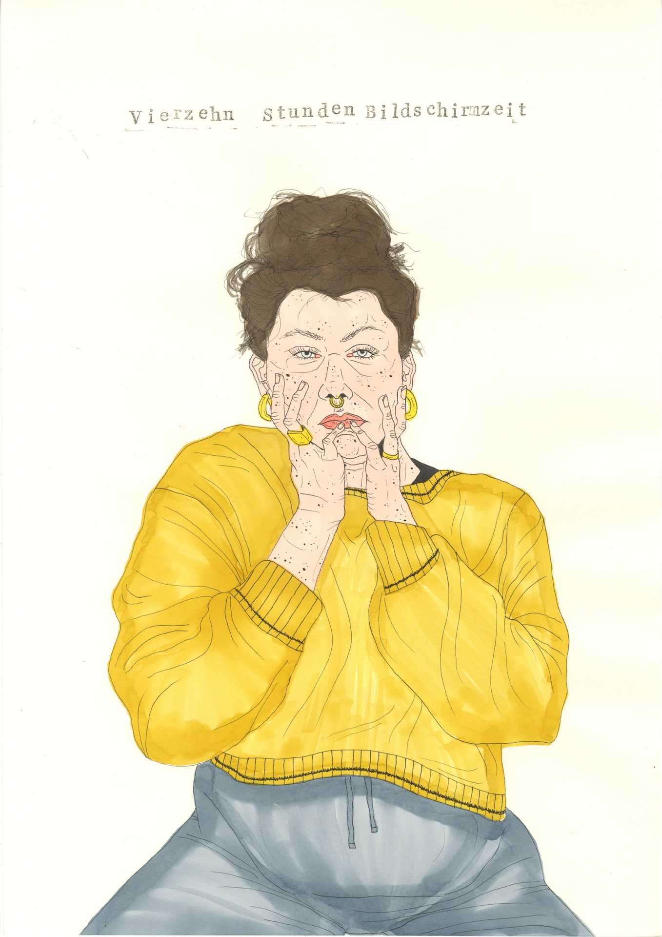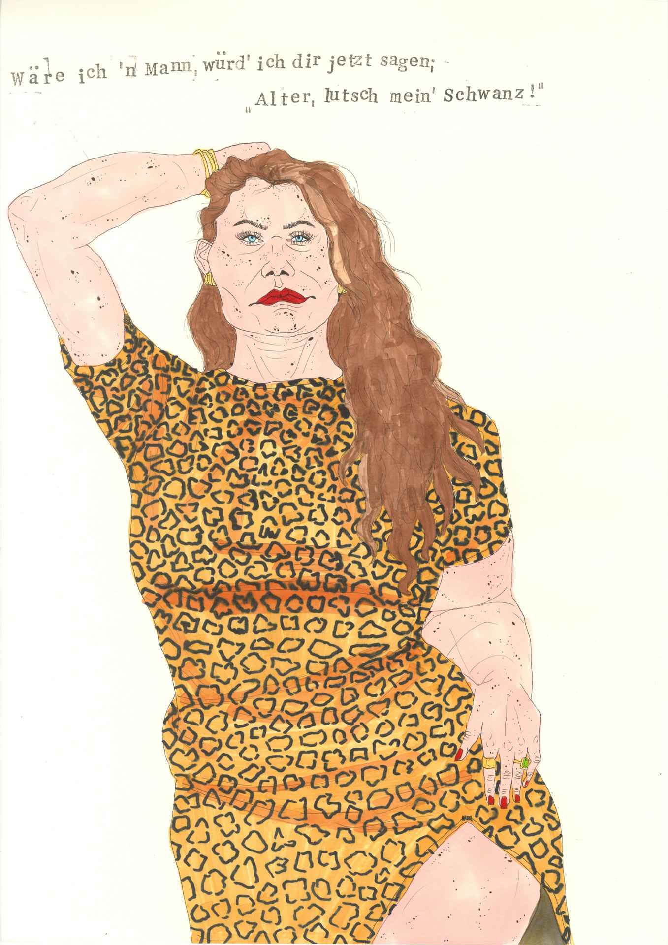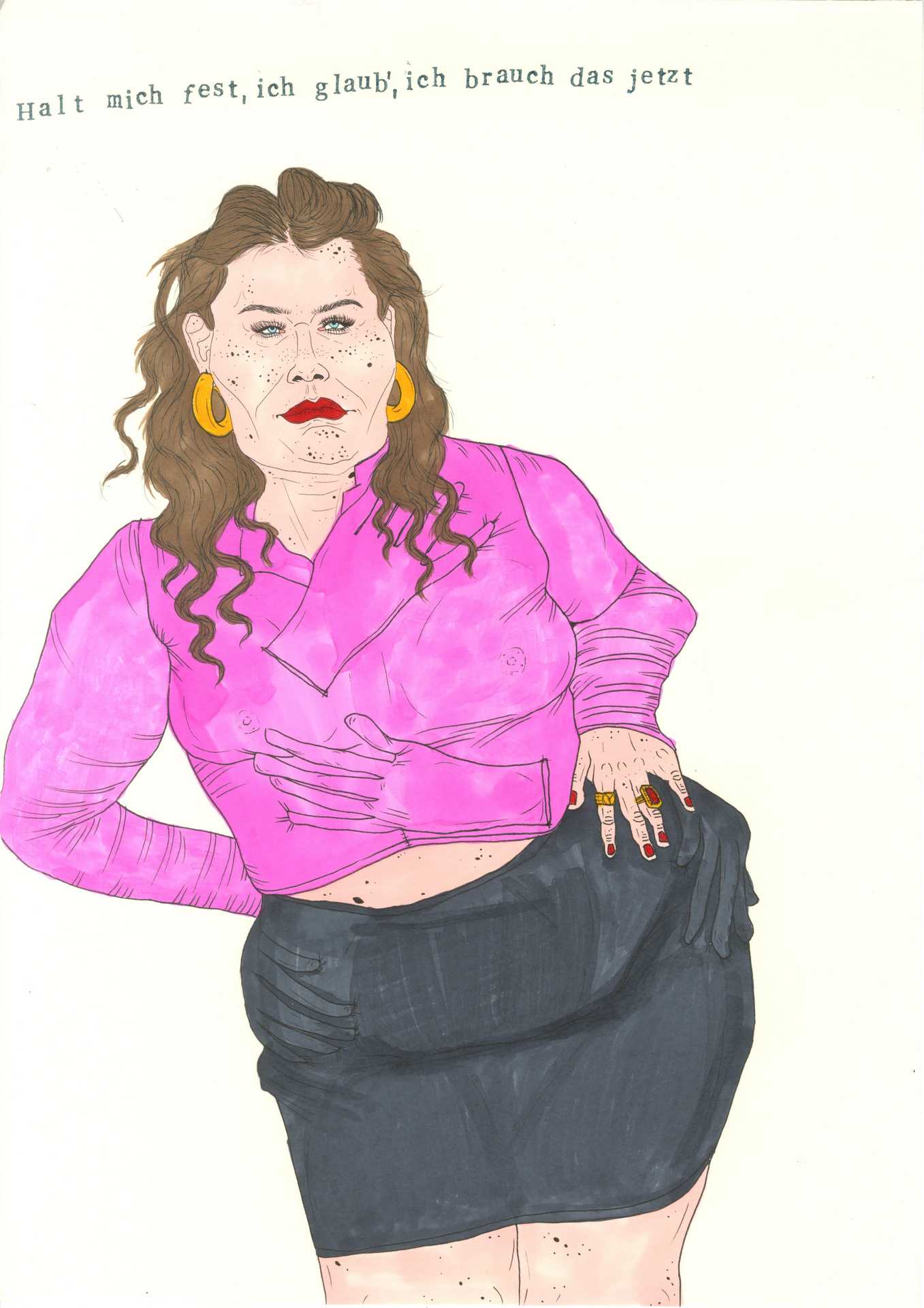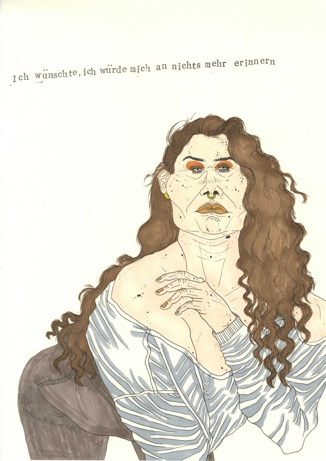 The photographic work shows intimate portraits in printed T-shirts. Tragically funny sayings about hellish culture-shock and diabolical forlornness address what it is to be human in this world: