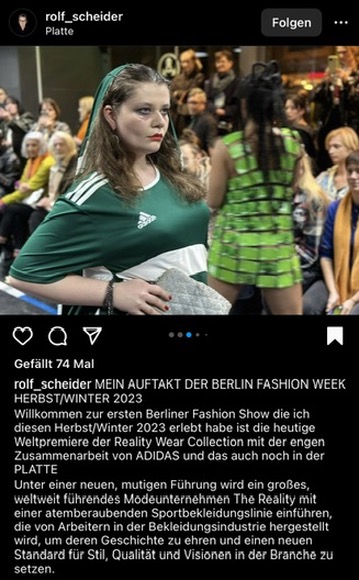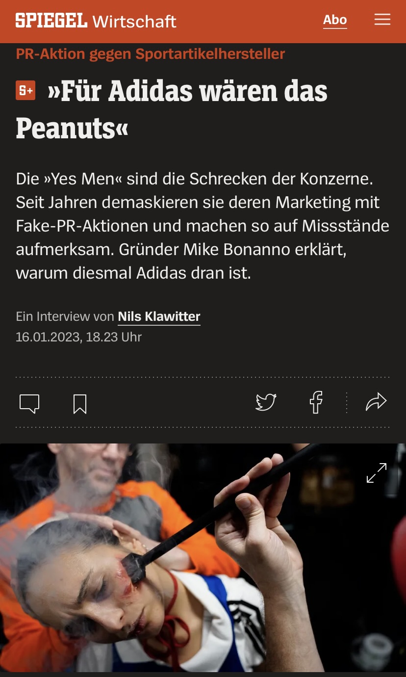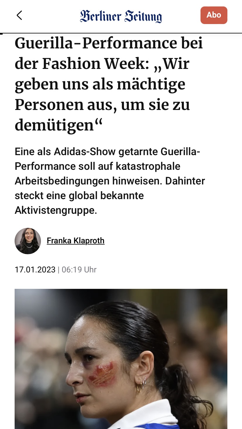 Gemeinsam mit dem Berliner Designteam „Threads and Tits“ und der Arbeitsrechtsorganisation „Clean Clothes Campaign“ inszenierten diese eine (fake) Modeschau „Adidas Realitywear“. Das Ziel der Kampagne ist es Aufmerksamkeit auf die schlechten Arbeitsbedingungen der Marke zu lenken, insbesondere in Kambodscha.