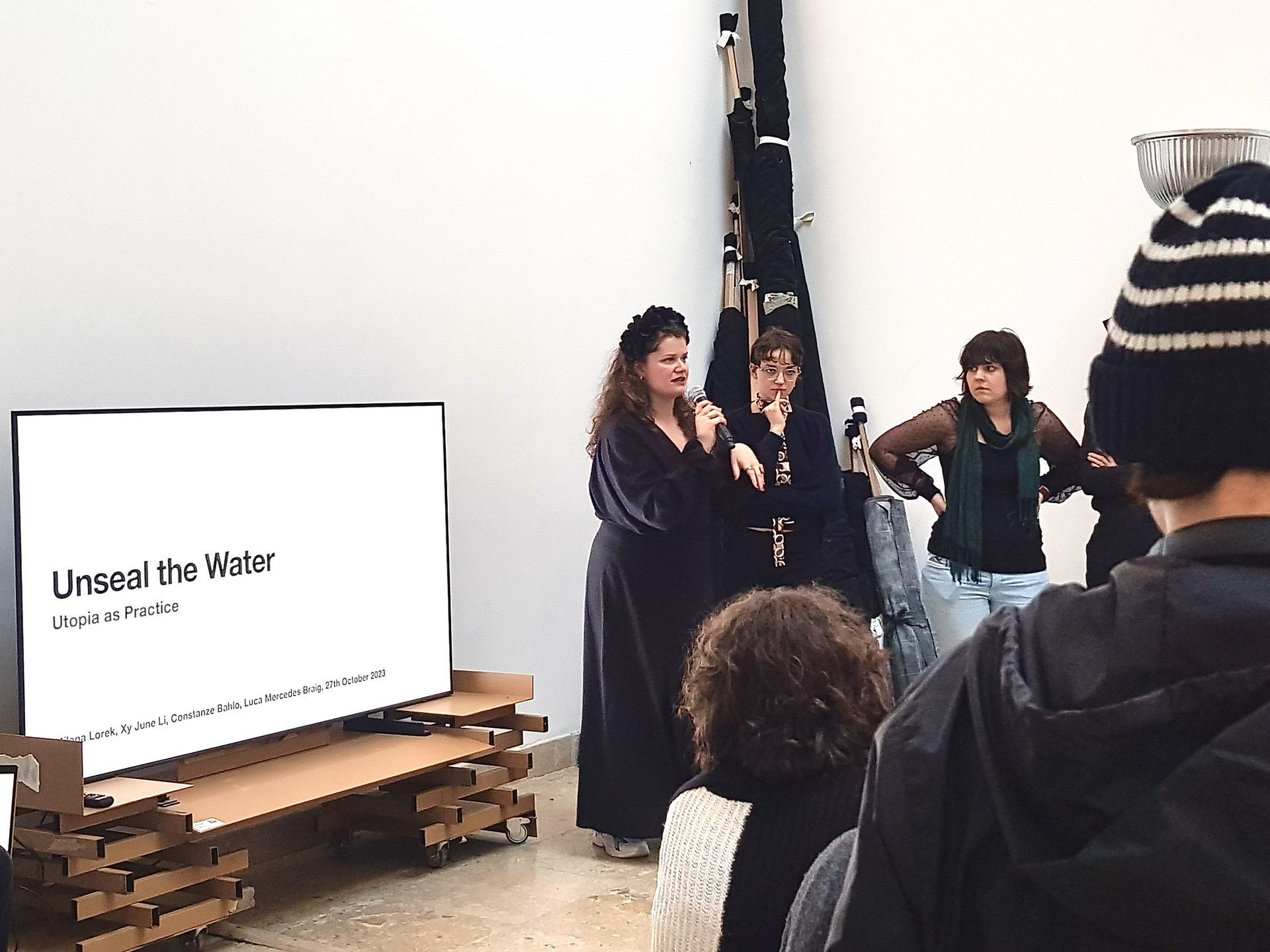 Die Künstler*innen Rheim Alkadhi, Lamin Fofana, Mohsen Hazrati, Nkhensani Mkhari, Jan Nikolai Nelles, Mitra Wakil & Fabian Hesse präsentierten ihre Position in kurzen Vorträgen, mit Eröffnungsworten der Kuratorin der 15. Triennale Kleinplastik Fellbach, Elke aus dem Moore.