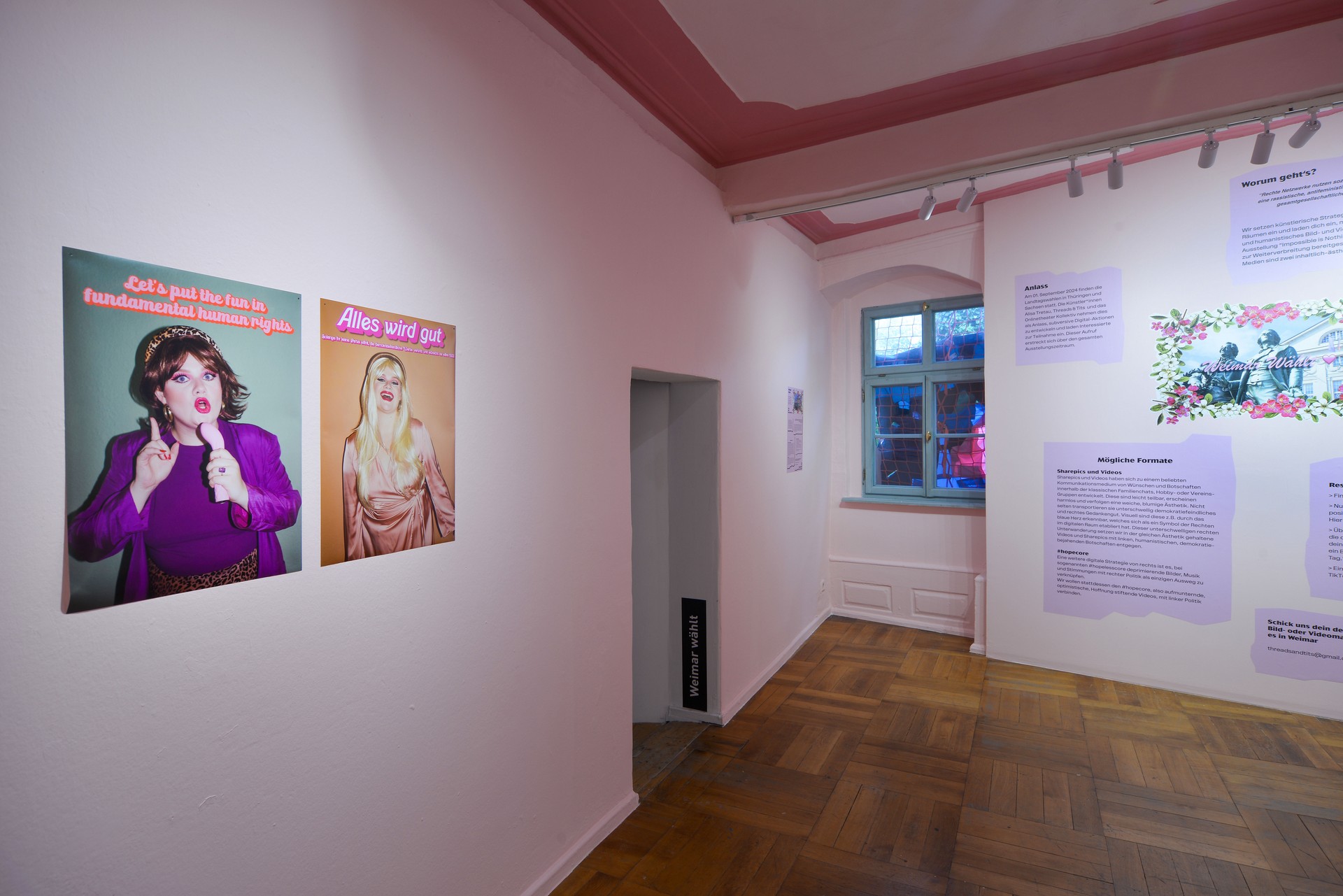 Im Rahmen ihrer Ausstellung "Impossible is Nothing" mit The Yes Men in der ACC Weimar und der damals bevorstehenden Landtagswahlen in Thüringen am 01. September 2024 riefen Threads & Tits zu einem Call for Participation auf. Sie wandten und wenden künstlerische Strategien zur De-Radikalisierung im digitalen Raum an und luden ein daran teilzunehmen. Die Einreichungen sollten eine Weiterentwicklung der Medien sein, die demokratiefördernd ist und rechten Netzwerken etwas entgegensetzt #hopecore