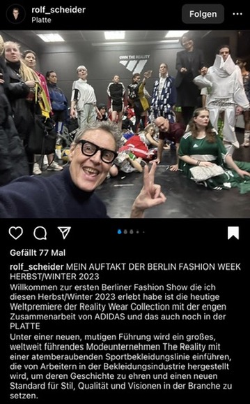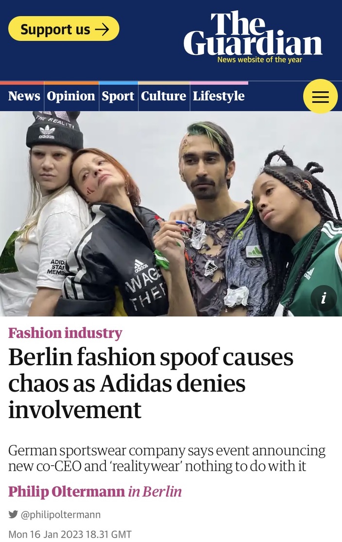 Gemeinsam mit dem Berliner Designteam „Threads and Tits“ und der Arbeitsrechtsorganisation „Clean Clothes Campaign“ inszenierten diese eine (fake) Modeschau „Adidas Realitywear“. Das Ziel der Kampagne ist es Aufmerksamkeit auf die schlechten Arbeitsbedingungen der Marke zu lenken, insbesondere in Kambodscha.