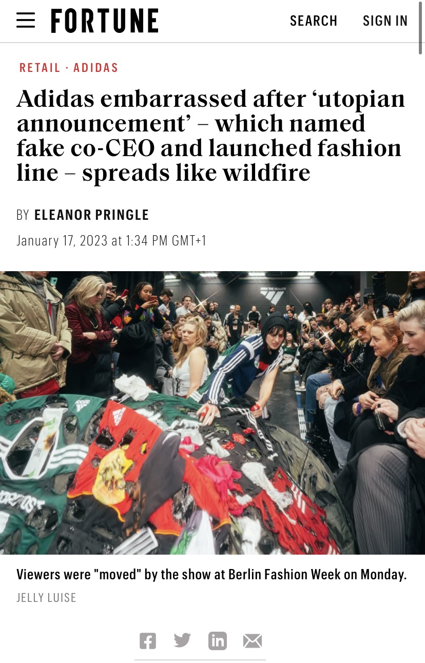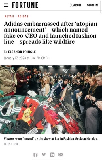 Dieser vermeintliche Wendepunkt wurde als Anlass genommen eine neue Kollektion zu präsentieren. Dem Publikum wurde durch die plakative Kollektion und die skurrile Darbietung kriechender und verwundeter Models eine bizarre Realität vor Augen geführt. Gemischte Reaktionen wurden erzeugt, die die Zusehenden teils voller Hoffnung teils ratlos zurückließen, unsicher, ob die von Adidas vorgeschlagene Veränderung tatsächlich real ist.